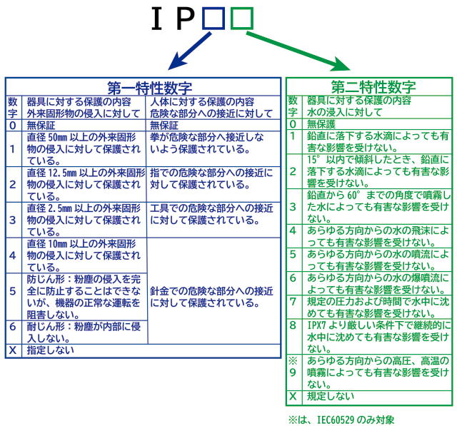 - 第一記号(6):防塵性能と人体に対して保護がどのくらいあるかを数字で表します。危険な箇所への接近および外来固形物(ごみ・ほこり)に対する保護等級を「0~6」の7段階の数字または文字「X」で示します。「6」は「粉塵が内部に侵入しない(耐塵形)」という最高レベルを指します。